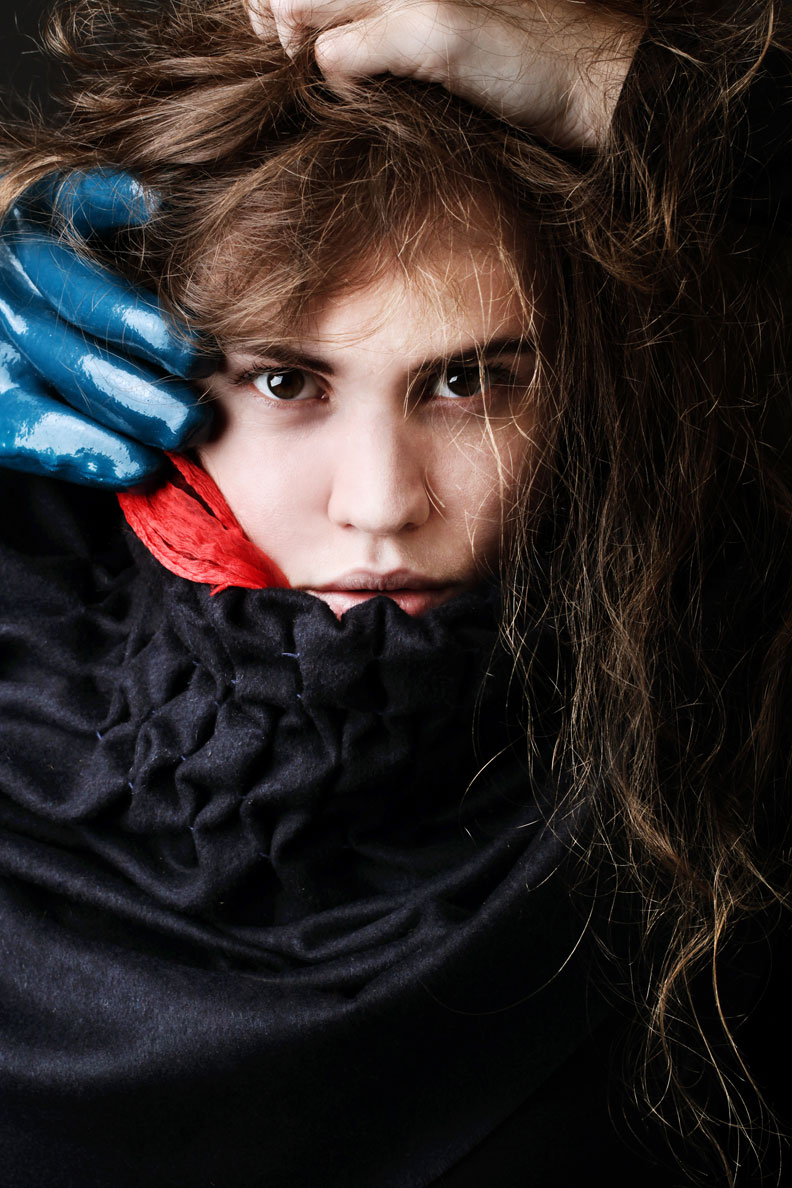 This collection was inpsired by the whale hunt of the Dutch after the Second World War. After this war fats and oils were scarce in the Netherlands. This was a period of great scarcity throughout the war that torn Europe, and the Netherlands were no exception. Since the Dutch lacked both the money and opportunity to buy these necessary goods on the international market, they decided to go out ad get it themselves in the Antarctic. Big knifes cut the fat skin of the whales causing blood and stinking gall from theu insides to ooze over the ship's deck. Men, struggling, slithering and sliding, try to drag the big freshly cut slices of greasy whale flesh into the hold. A though life led by gory conditions and the blistering cold.