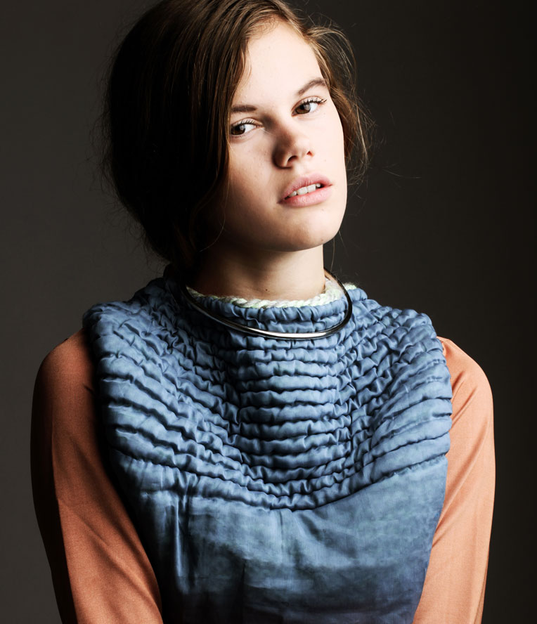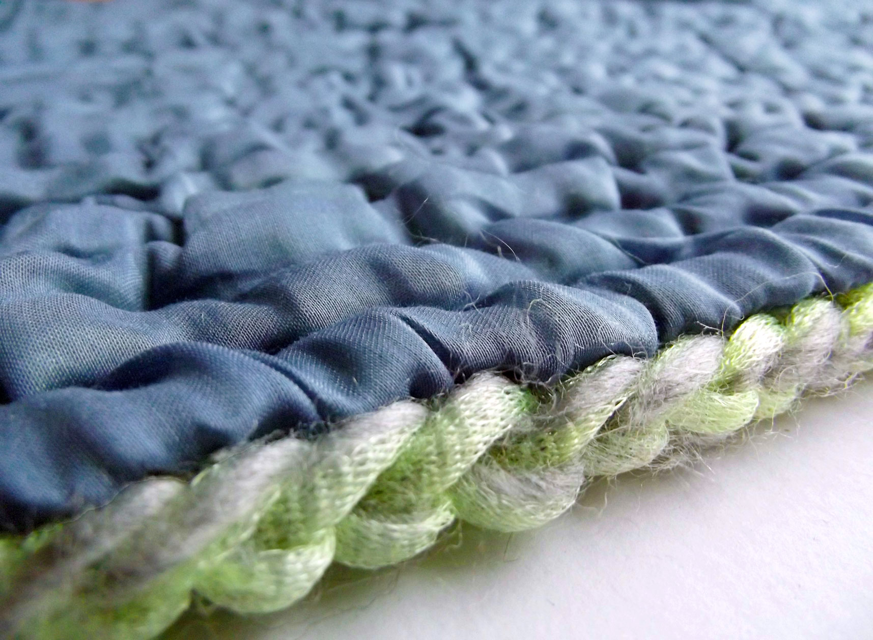 Cotton coated fabric smocked to create a volume. Knitted hand dyed fabric consisting out of plastic yarns.
