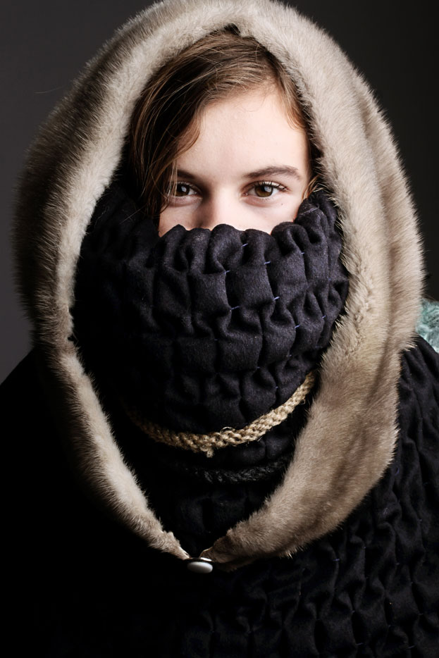 The fabrics represent the hard life on the 'Willem Barendsz'. Frabrics with firm and stiff bindings in order to prevent ripping and tearing. Materials pleated into big warm volumes like a whale, to surround you as to protect you against the cold.